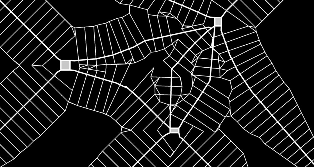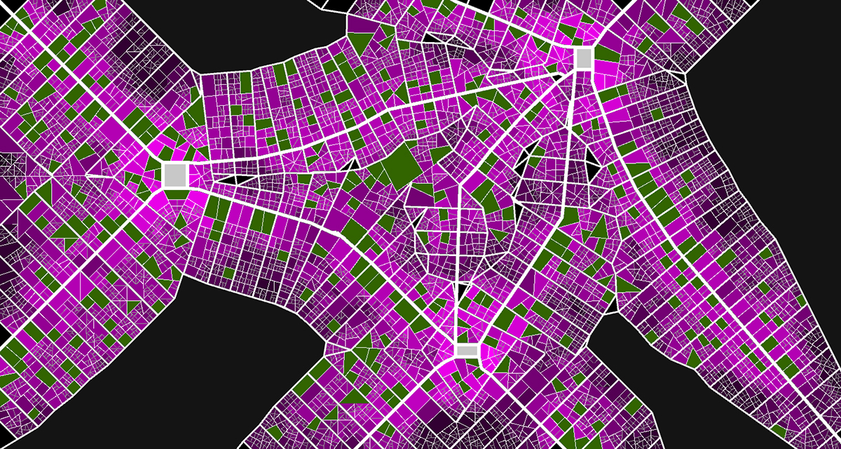 IndUrbN8c4B1 is an algorithmic approach to building new cities in India. The project was developed during a design studio at the TU Wien. It aims at creating a city structure significantly different from the rational planned cities of the modern era. To that goal it uses agents and recursion methods to create a system of streets with inscribed lots. Green spaces are allocated and a density gradient is applied to each lot according to density rules.