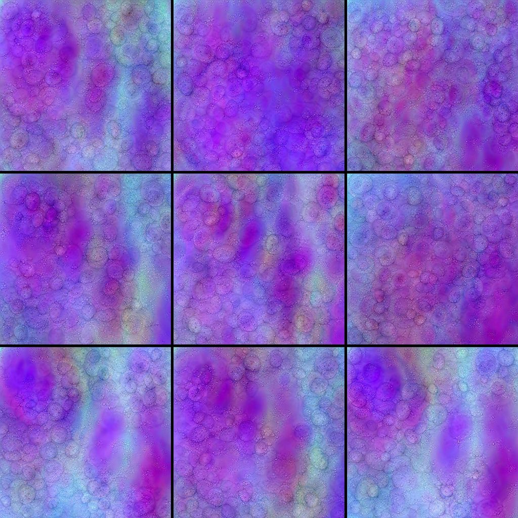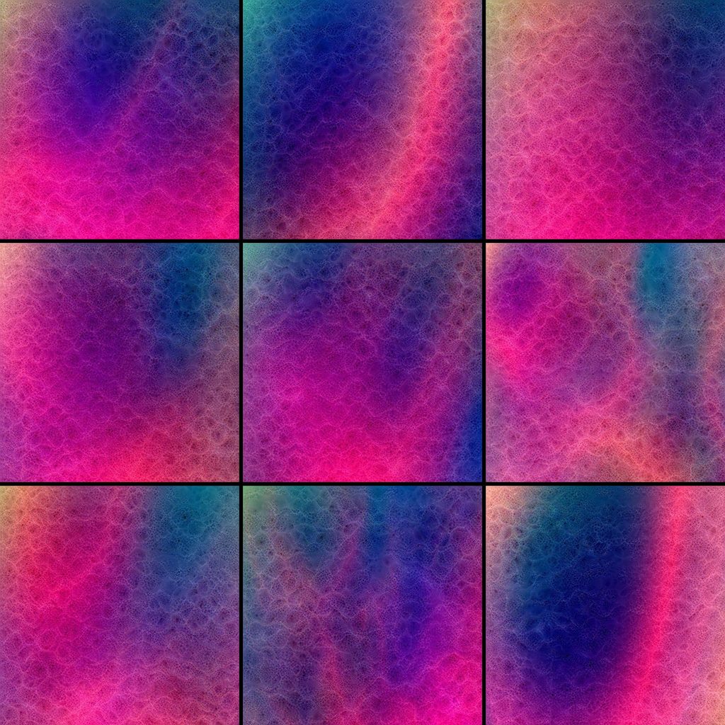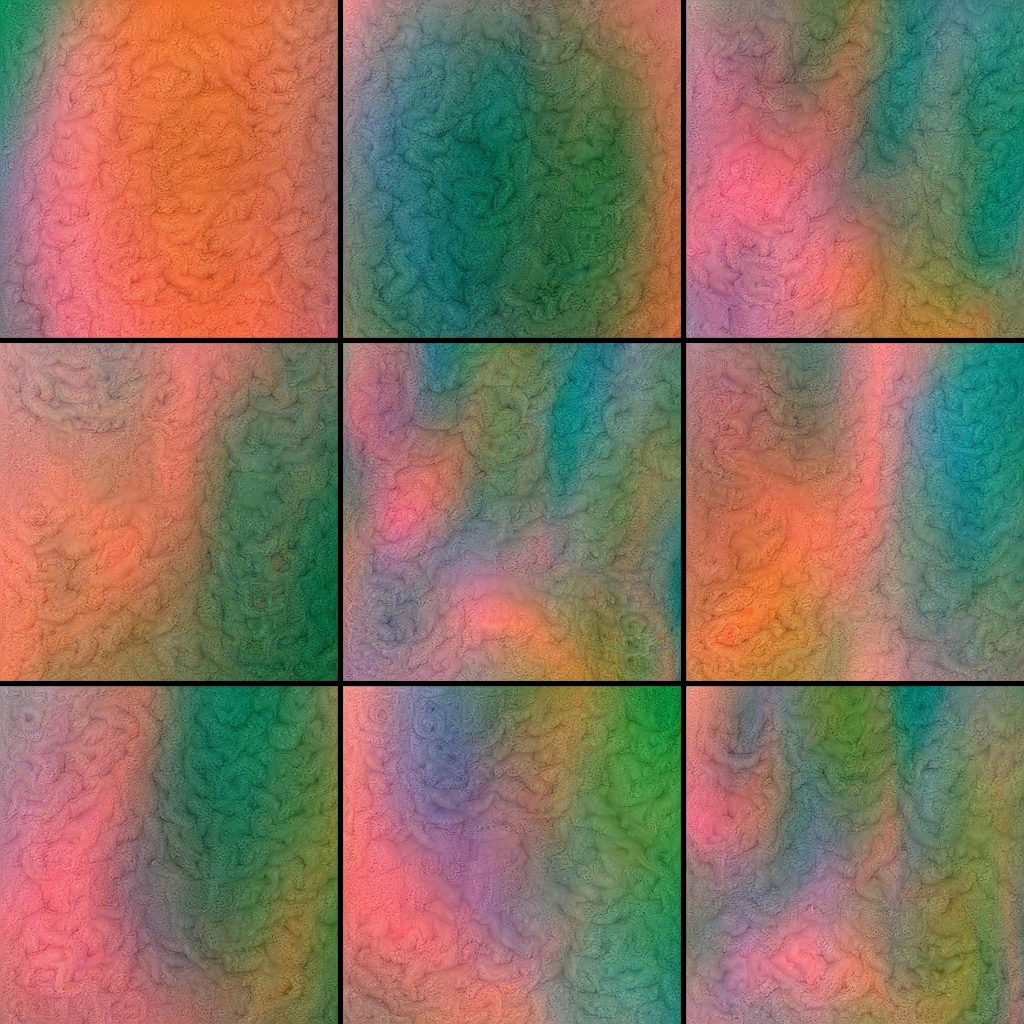 They are organized into six series of nine images with 3200*3200 pixels each. These groups were selected by mapping thousands of possible generations into a 2d embedding using uniform manifold approximation. This allows the selection of similarly structured images within the huge possibility space.