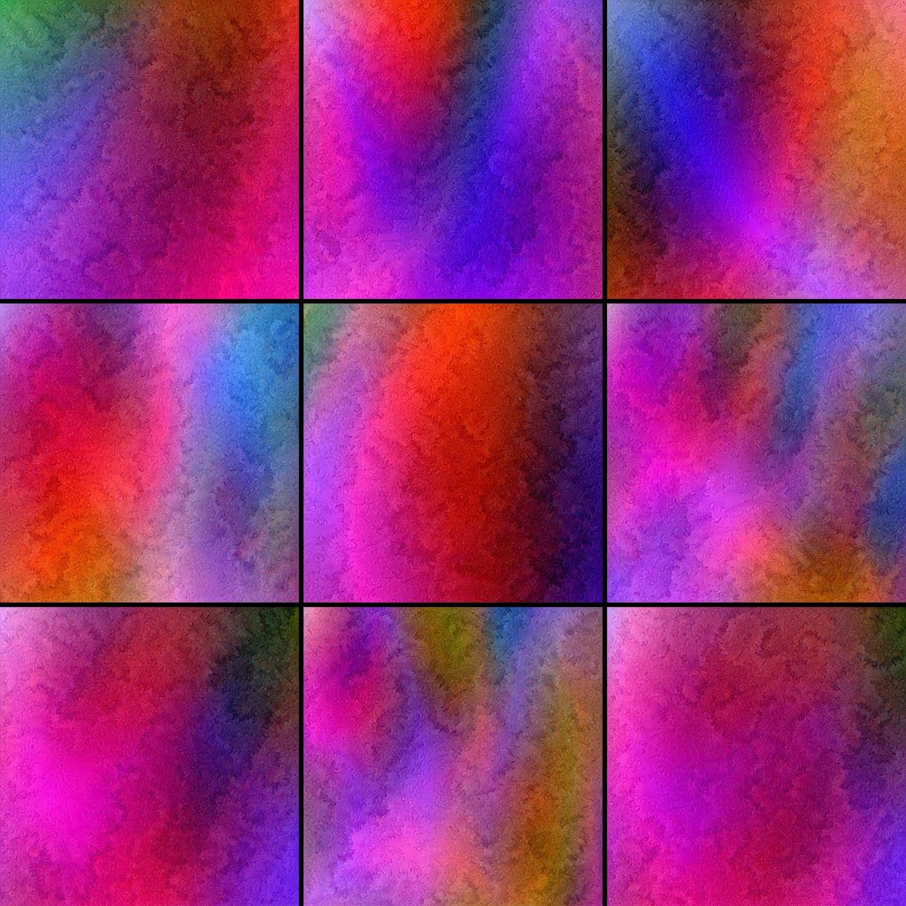 Results of the custom-built 2D fractal brownian motion generator which can generate ridged and turbulence noise were interpreted as red, green and blue color values. Different parameter combinations allow movement in the value landscape which yields several different and interesting patterns.