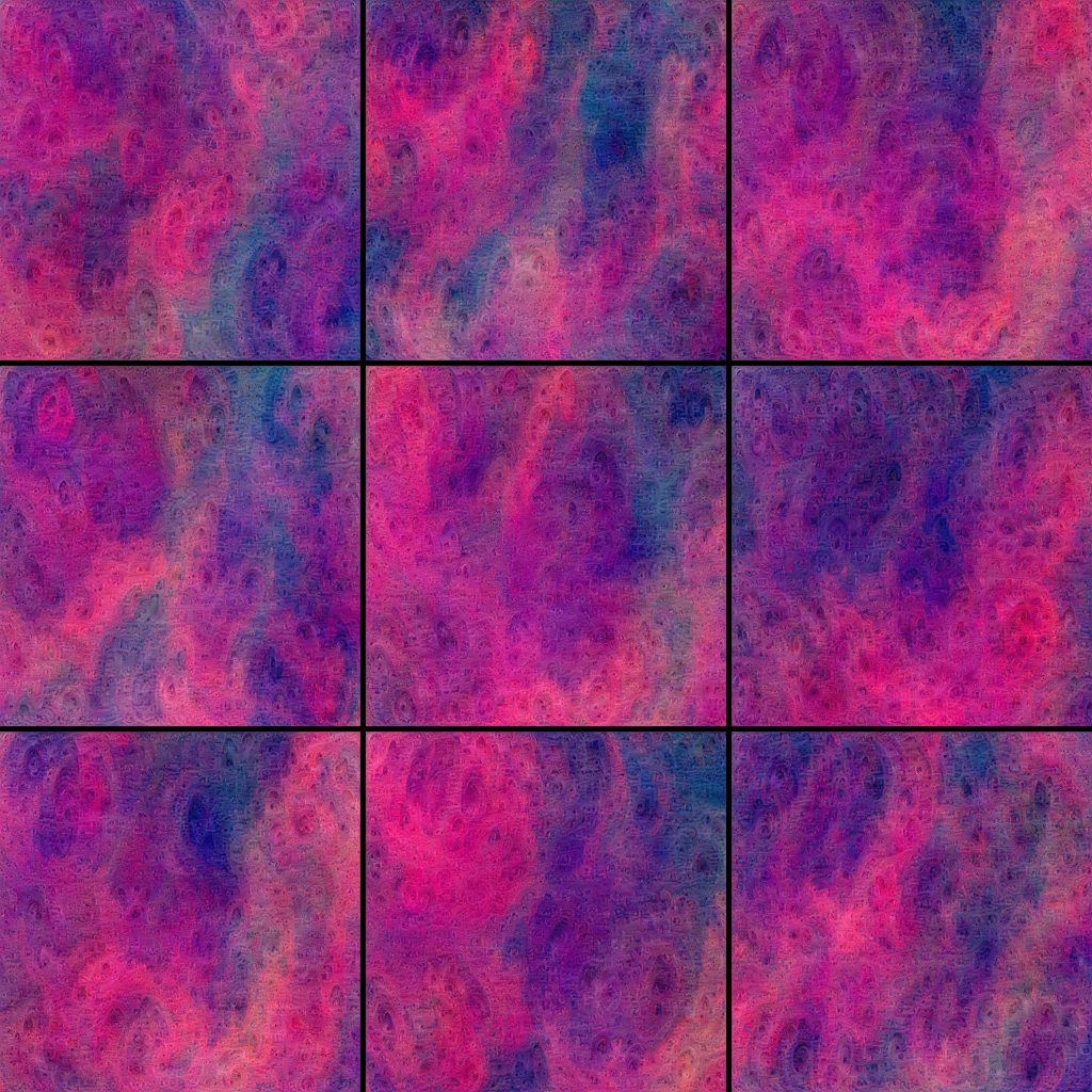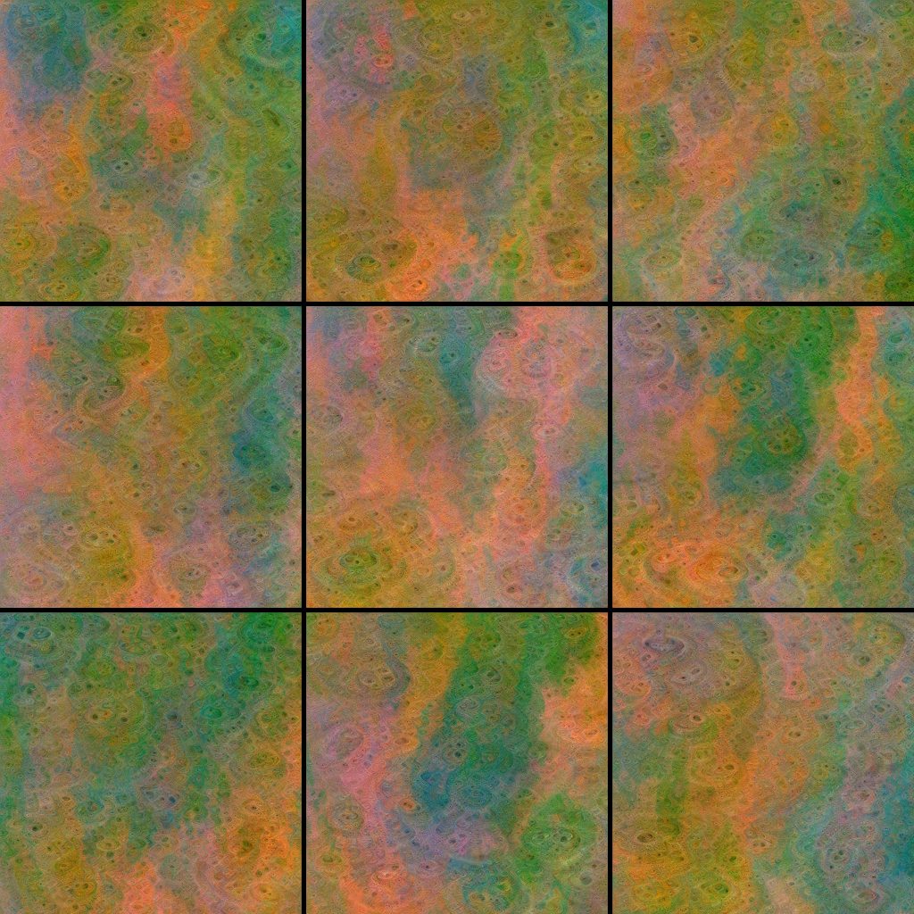 The outcome of these rgb fBM interpretations is fed into a deep dream neural network originally developed for image classification, which is used to amplify a certain structure in a neuron of the network’s layers in the image. This amplification step creates intricate sub patterns on the numerical landscape of the fBM generator and results in often unforeseen transformations.