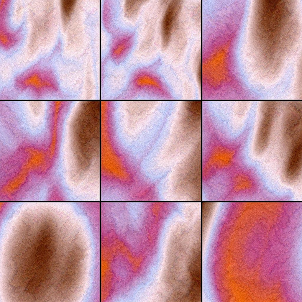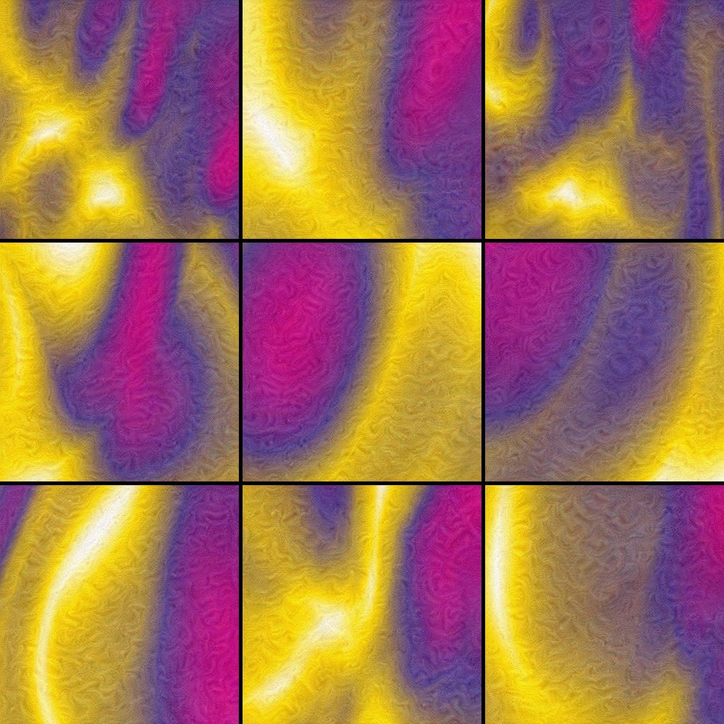 They are organized into six series of nine images with 3200*3200 pixels each. These groups were selected by mapping thousands of possible generations into a 2d embedding using uniform manifold approximation. This allows the selection of similarly structured images within the huge possibility space.