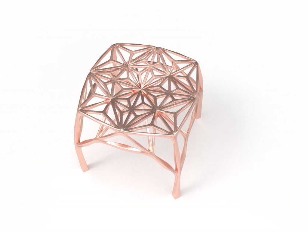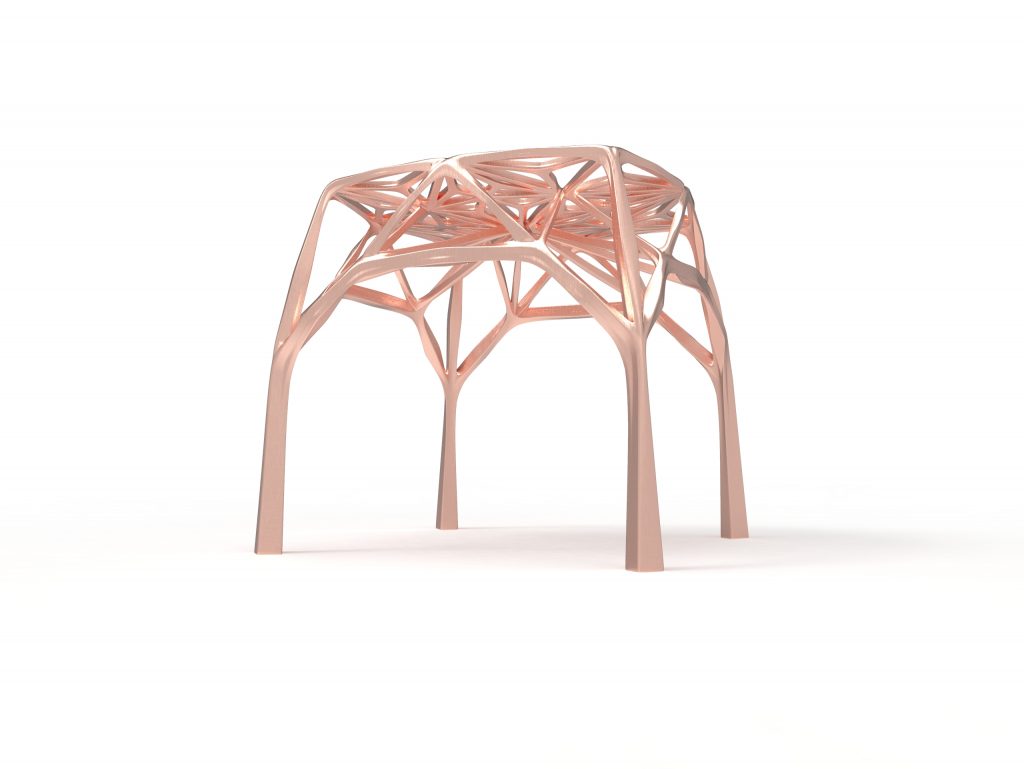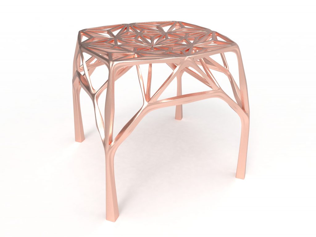 Using the modified version of my algorithmic system, which forms a continuous subdivided mesh structure from a line network, a stool design is articulated. 156 lines construct a branching shape emanating from four ground points. The structure is dominated by a highly subdivided upper layer in triangular arrangement and smooth geometry blending the linear elements in each node.